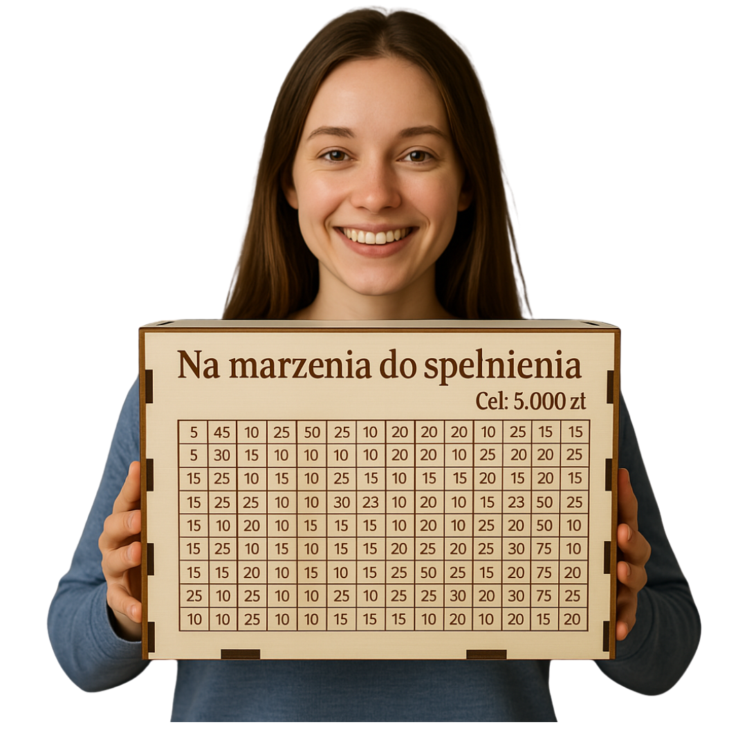 • Personalizacja: Możliwość wygrawerowania dowolnego celu oszczędzania, np. „Na wakacje marzeń”, „Na wesele”, „Na edukację”, czy „Spełnienia marzeń!”.