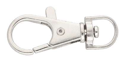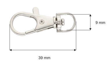 Karabińczyk metalowy typu rybka 10 mm o szerokości 9 mm, wysokości 39 mm i wadze 3,1 g. W powłoce galwanicznej nikiel, lekki. Karabińczyki metalowe to jedne z najbardziej popularnych artykułów kaletniczych. Używa się ich jako mocowania pasków lub zapięcia w torbach i plecakach, a także dodatki do odzieży oraz gadżetów reklamowych i dla zwierząt.