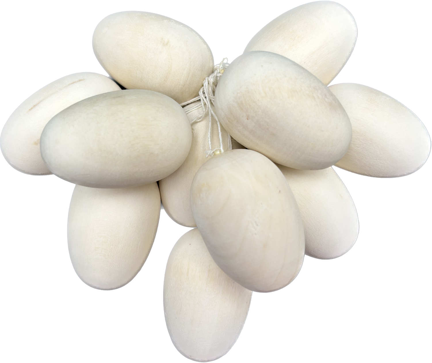 Jajka drewniane 4 cm ze sznureczkami. Opakowanie zawiera 12 szt.