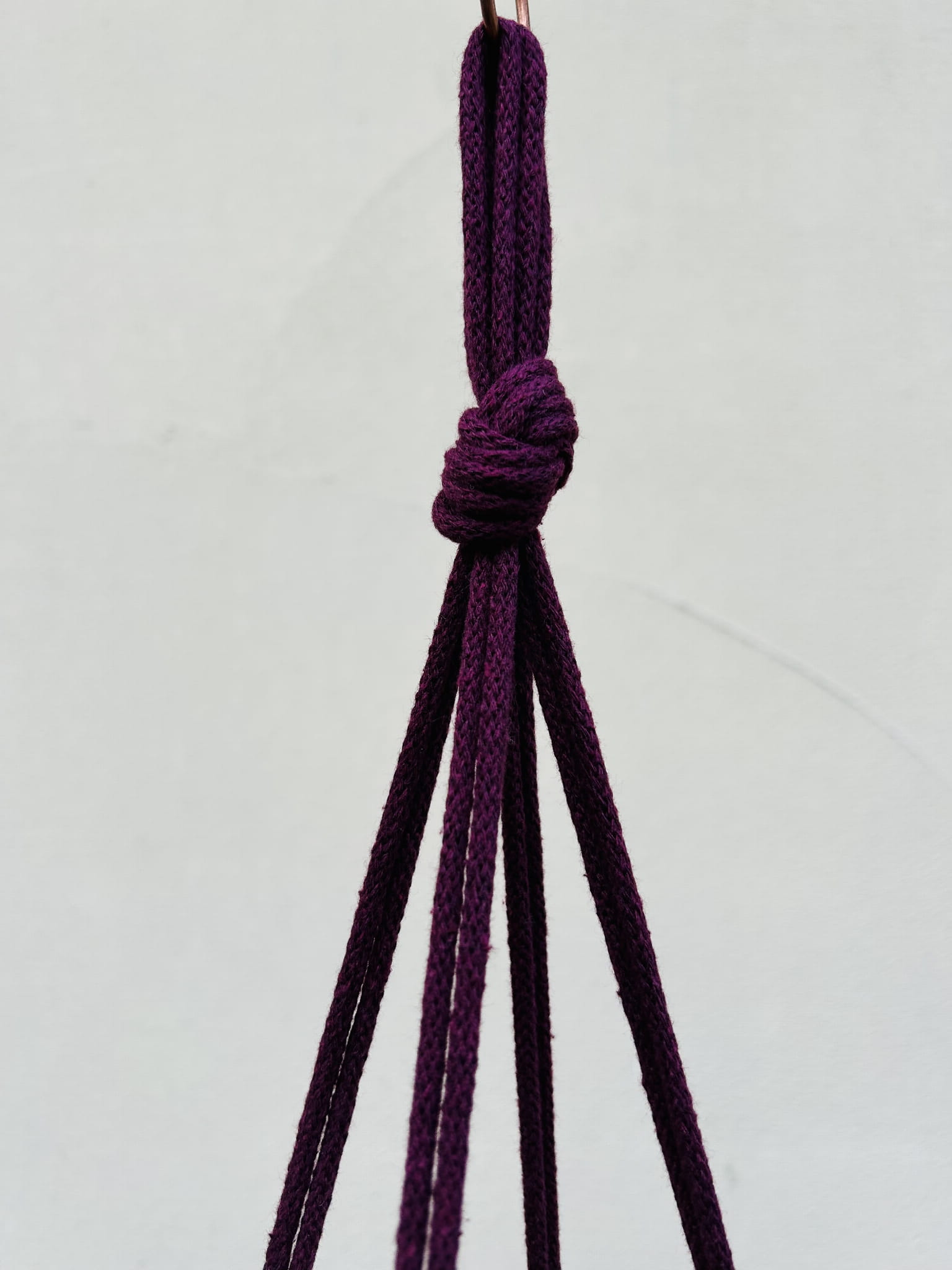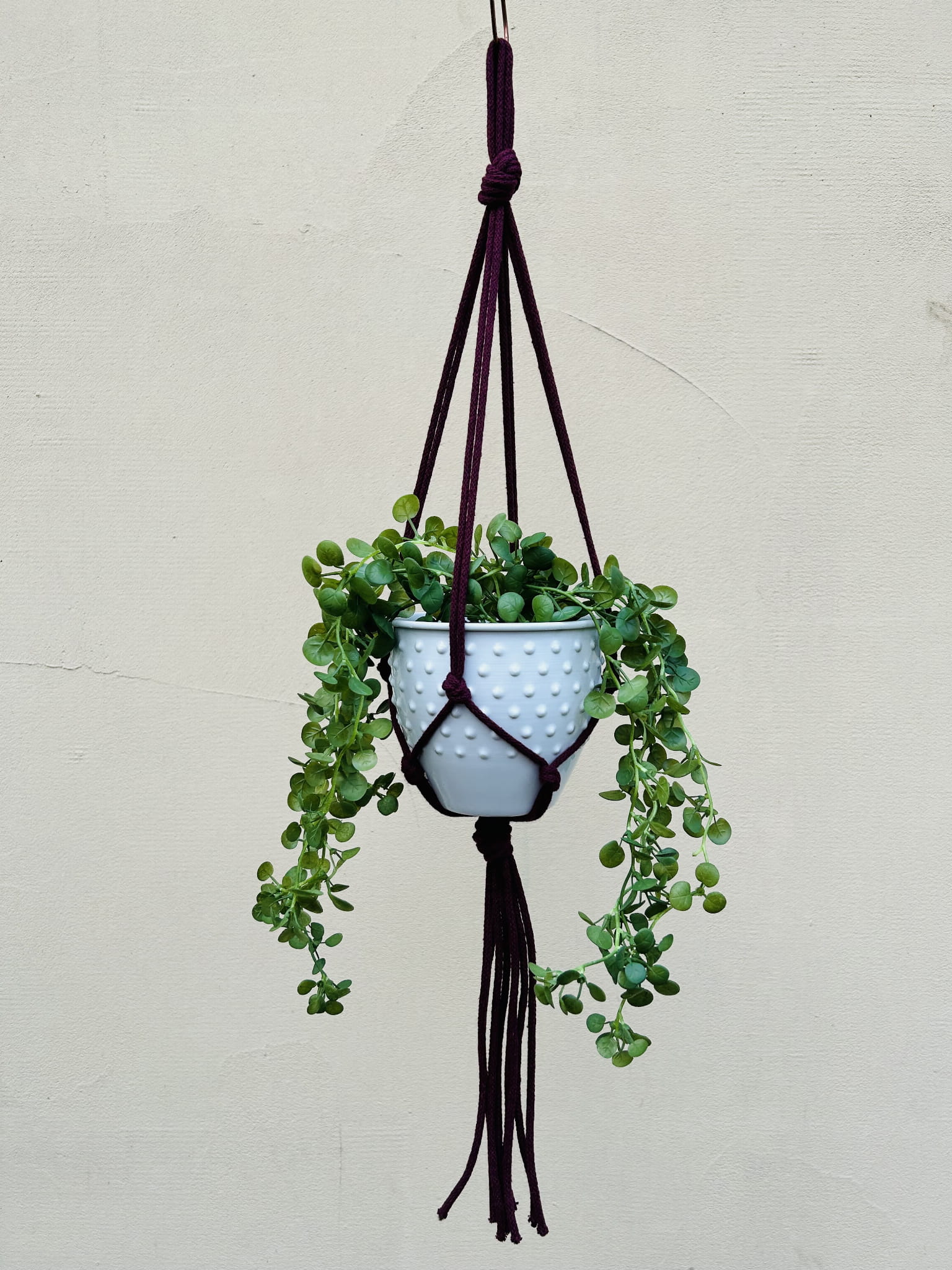 Kwietnik wiszący makrama. Wykonany ręcznie ze sznurka bawełnianego 5mm w kolorze burgund.