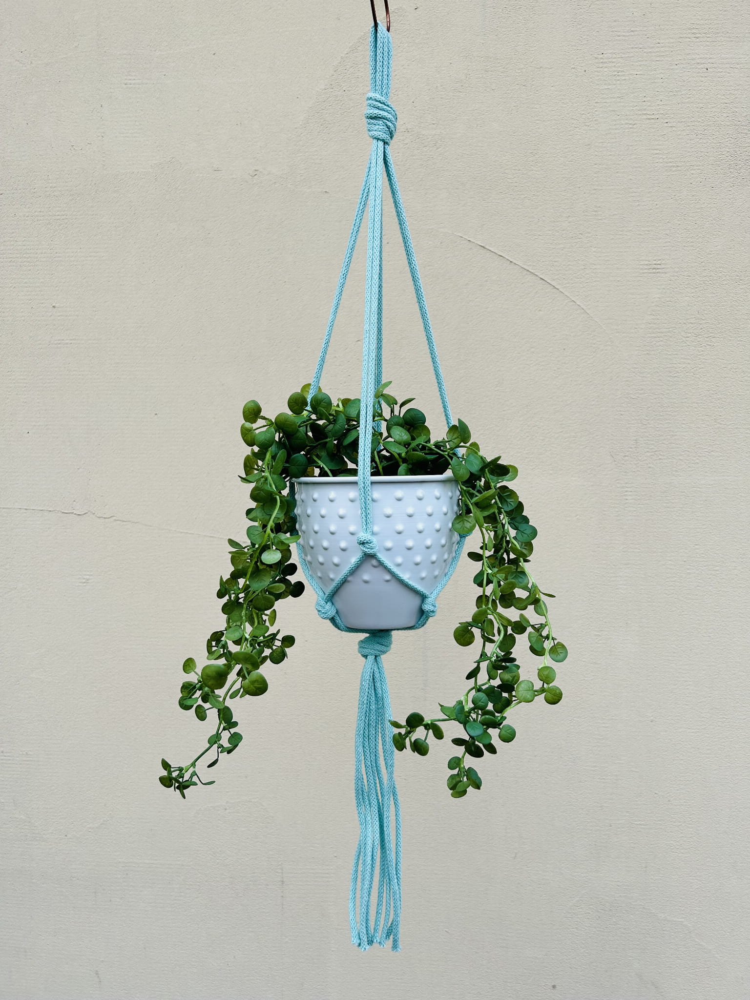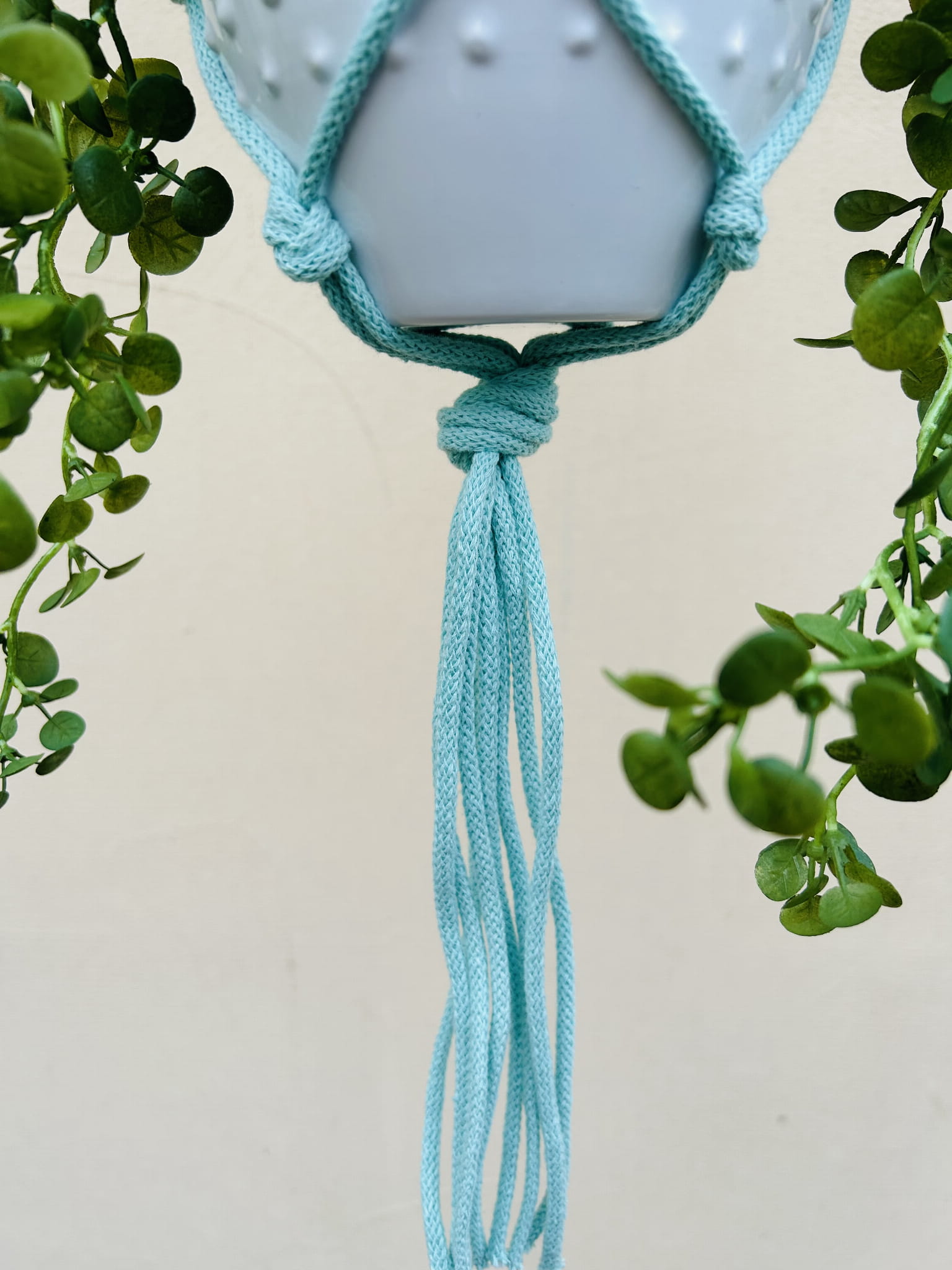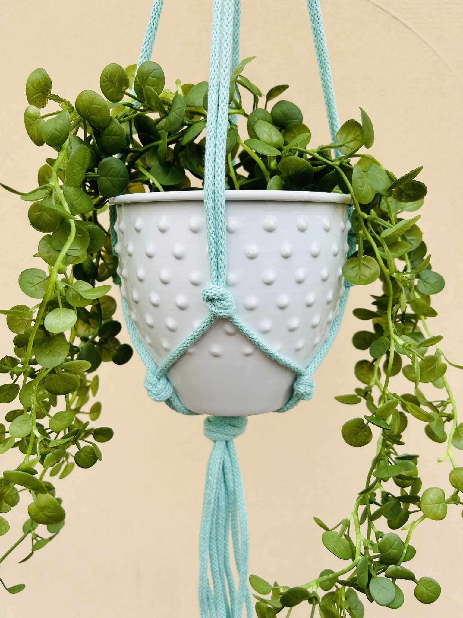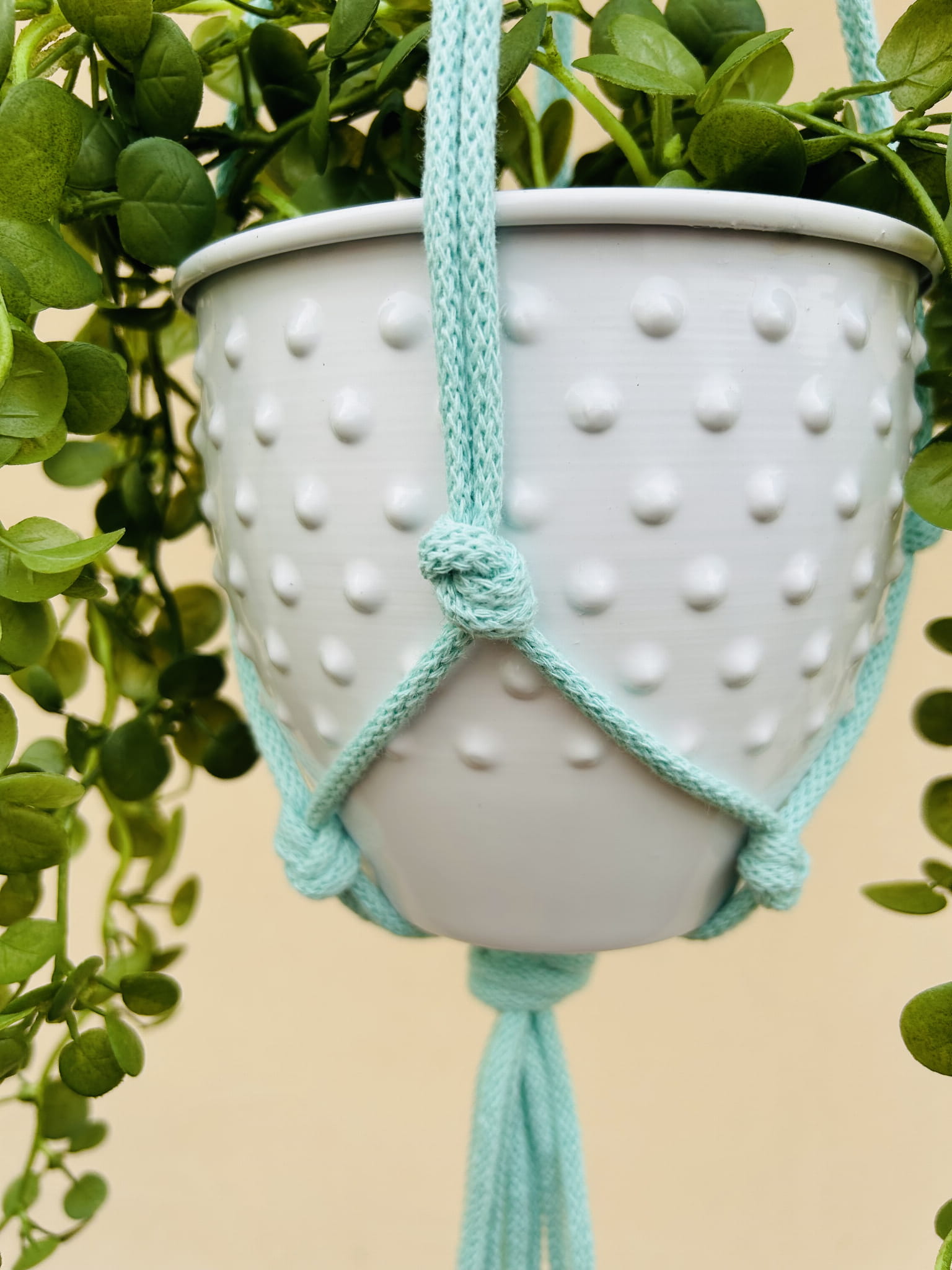 Kwietnik wiszący makrama. Wykonany ręcznie ze sznurka bawełnianego 5mm w kolorze miętowym.