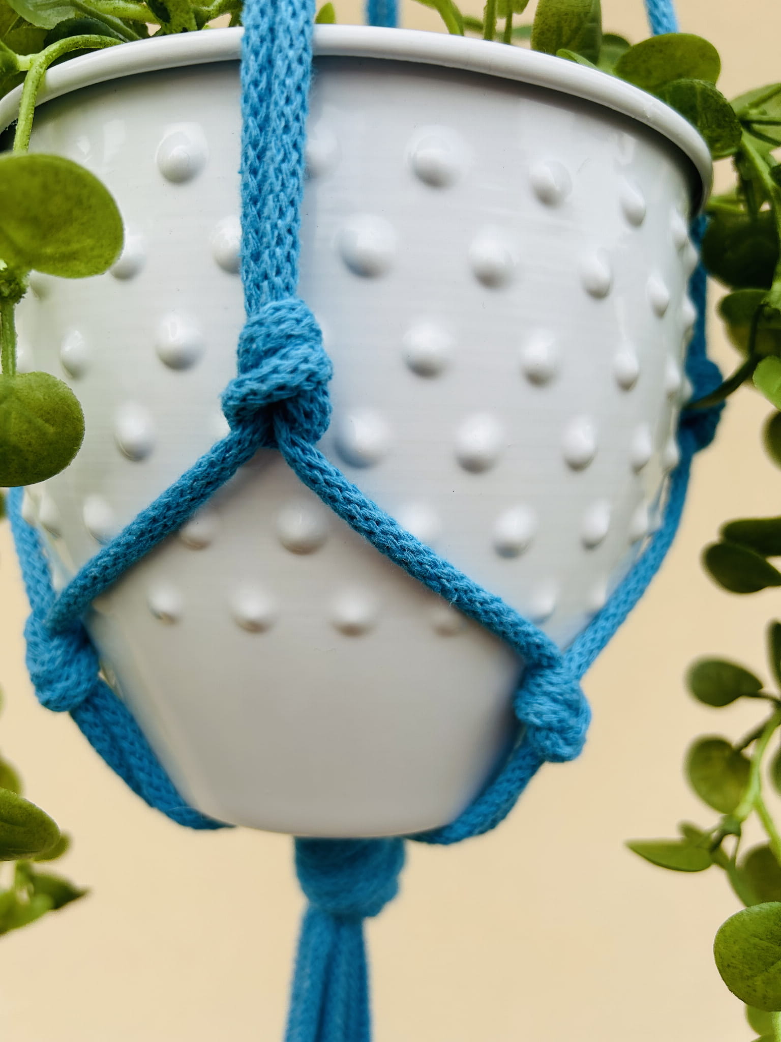 Kwietnik wiszący makrama. Wykonany ręcznie ze sznurka bawełnianego 5mm w kolorze niebieskim.