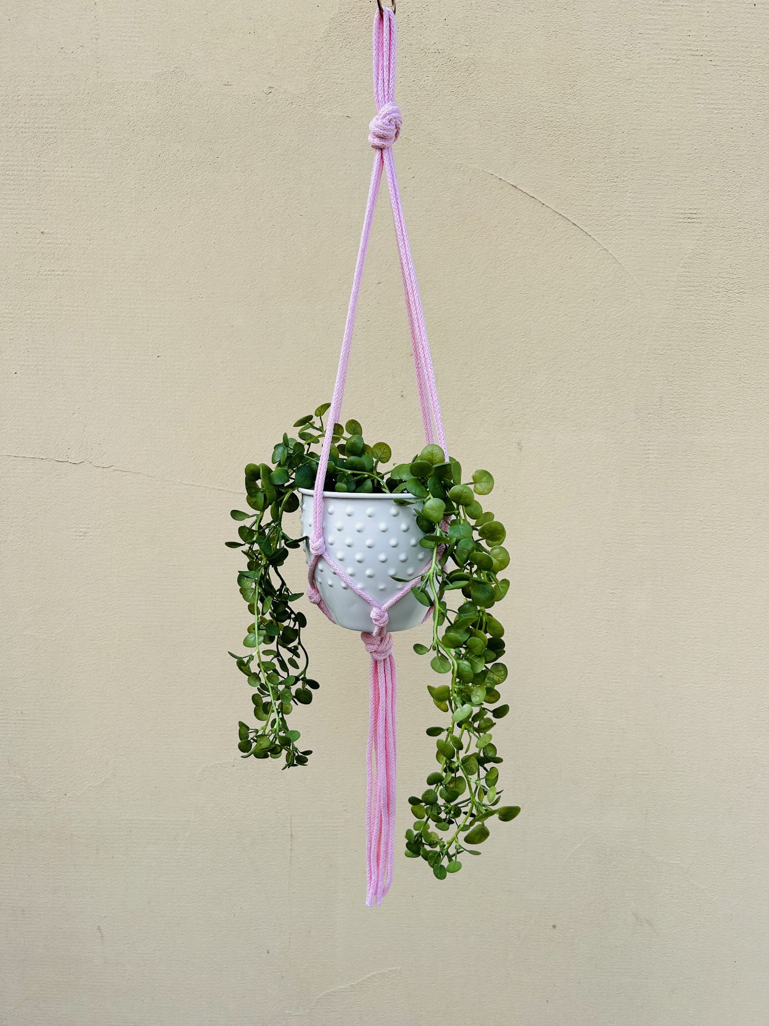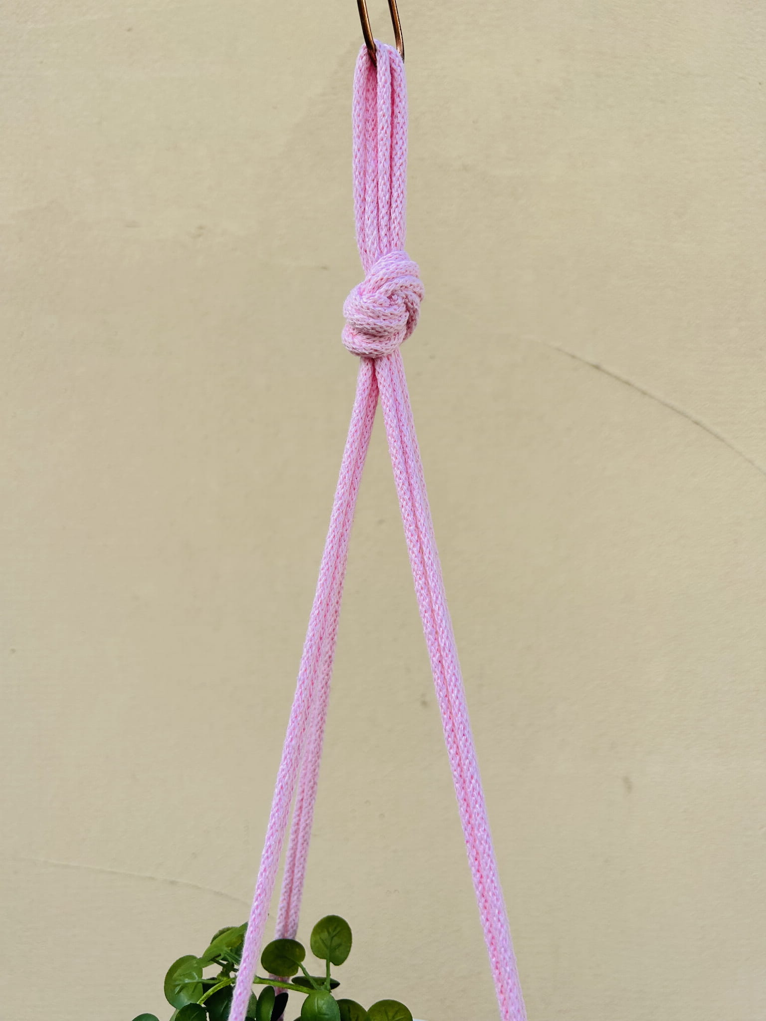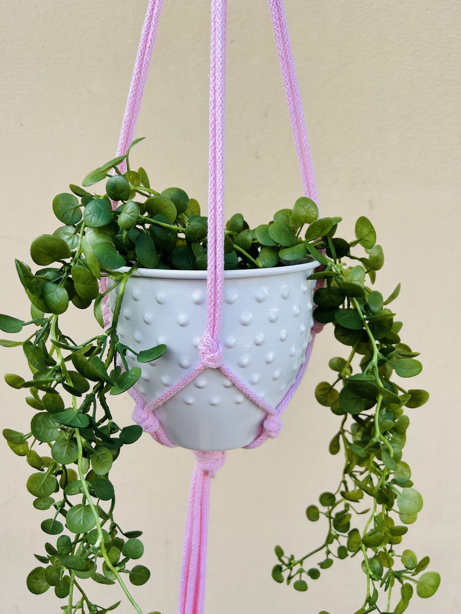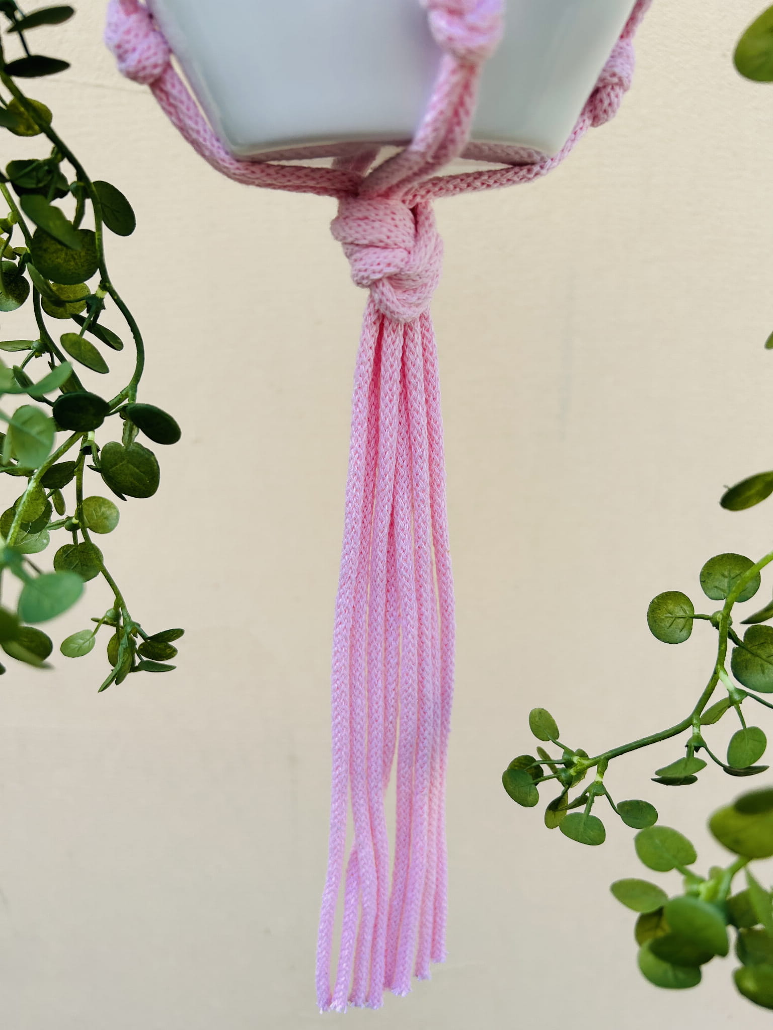 Kwietnik wiszący makrama. Wykonany ręcznie ze sznurka bawełnianego 5mm w kolorze różowym.