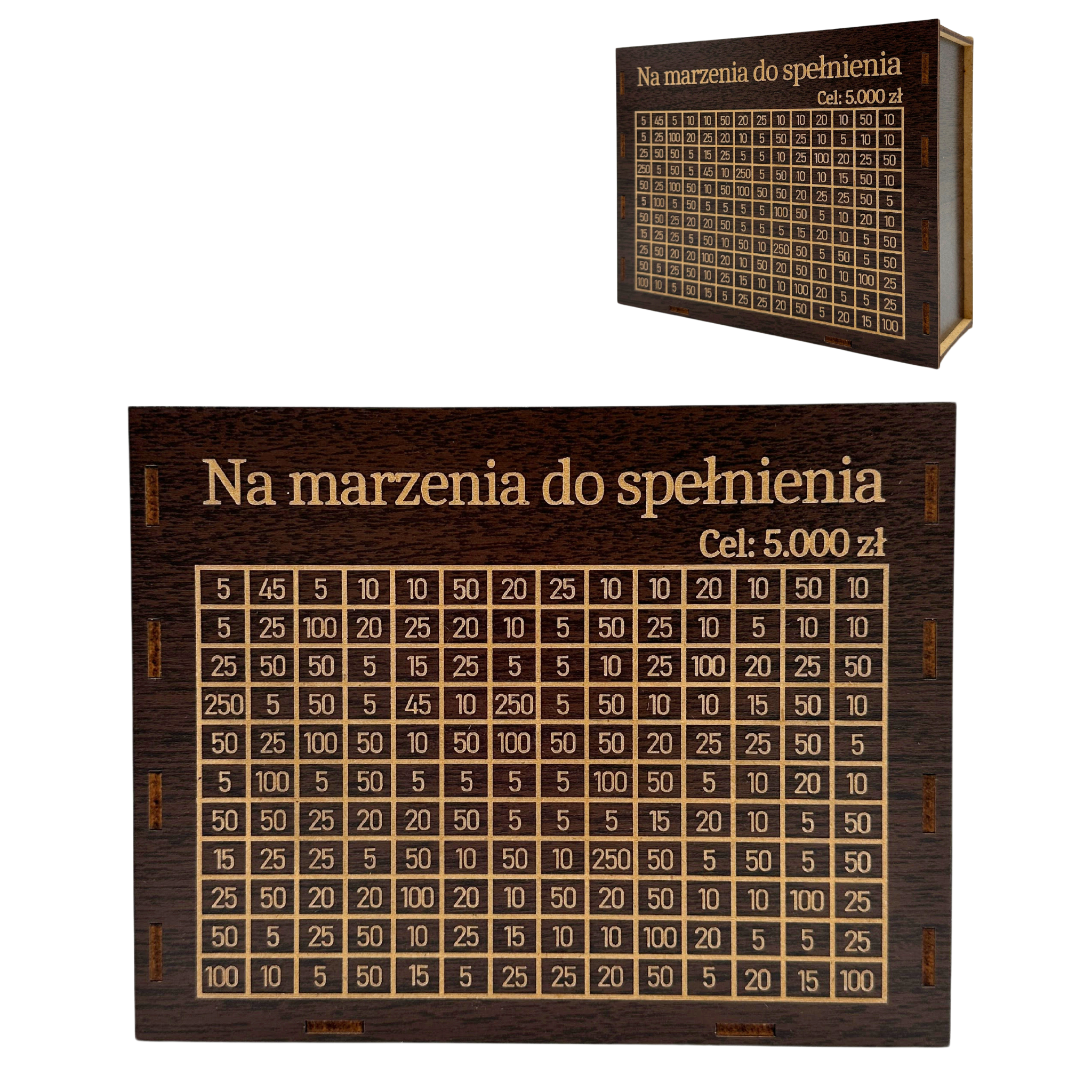• Personalizacja: Możliwość wygrawerowania dowolnego celu oszczędzania, np. „Na wakacje marzeń”, „Na wesele”, „Na edukację”, czy „Spełnienia marzeń!”.