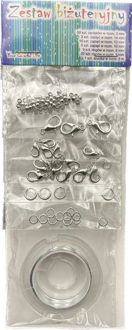 Zawiera 93 elementy: zaciski, zapięcia, ringi + drucik o długości 3m