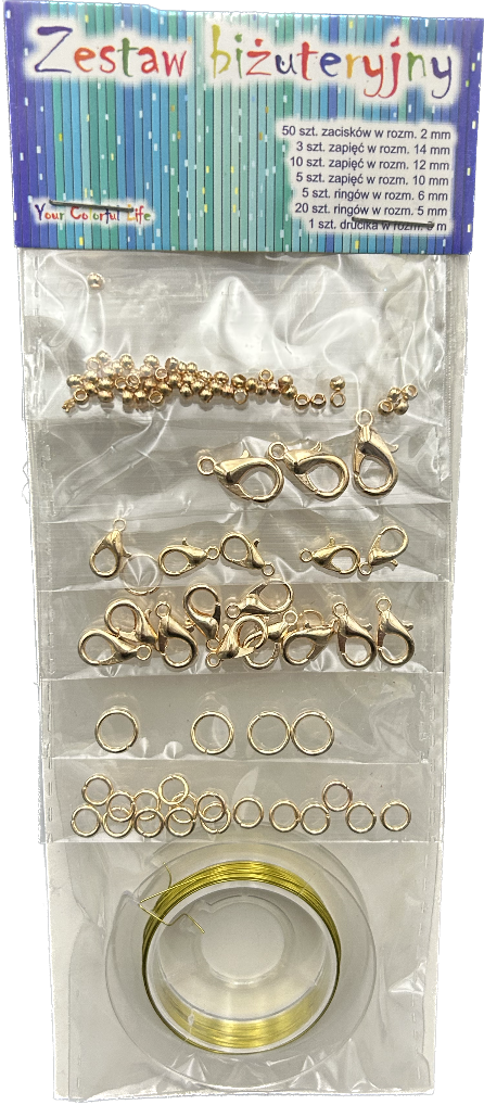 Zawiera 93 elementy: zaciski, zapięcia, ringi + drucik o długości 3m