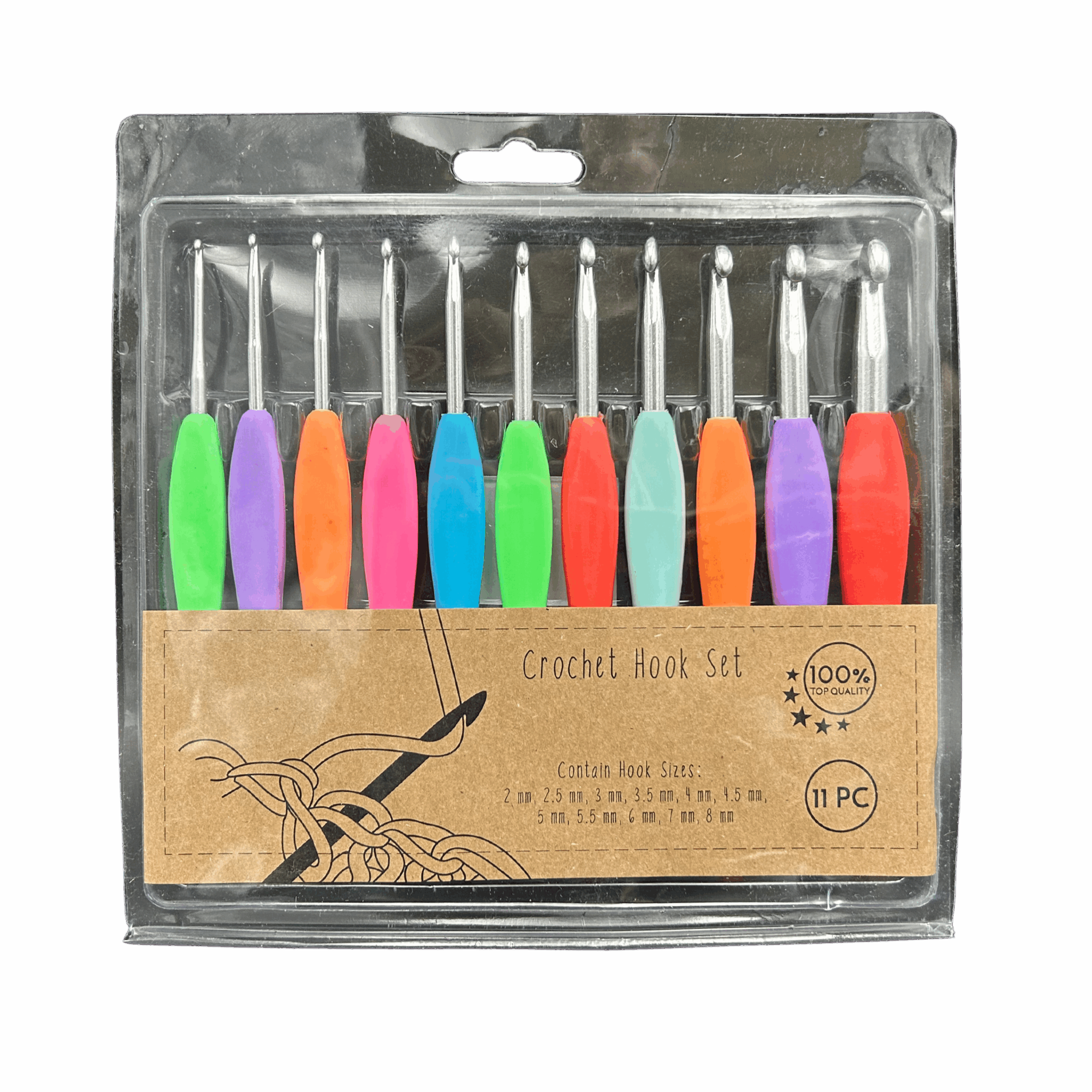 Komplet zawiera 11 rozmiarów szydełek: 2 mm, 2,5 mm, 3 mm, 3,5 mm, 4 mm, 4,5 mm, 5 mm, 5,5 mm, 6 mm, 7 mm, 8 mm